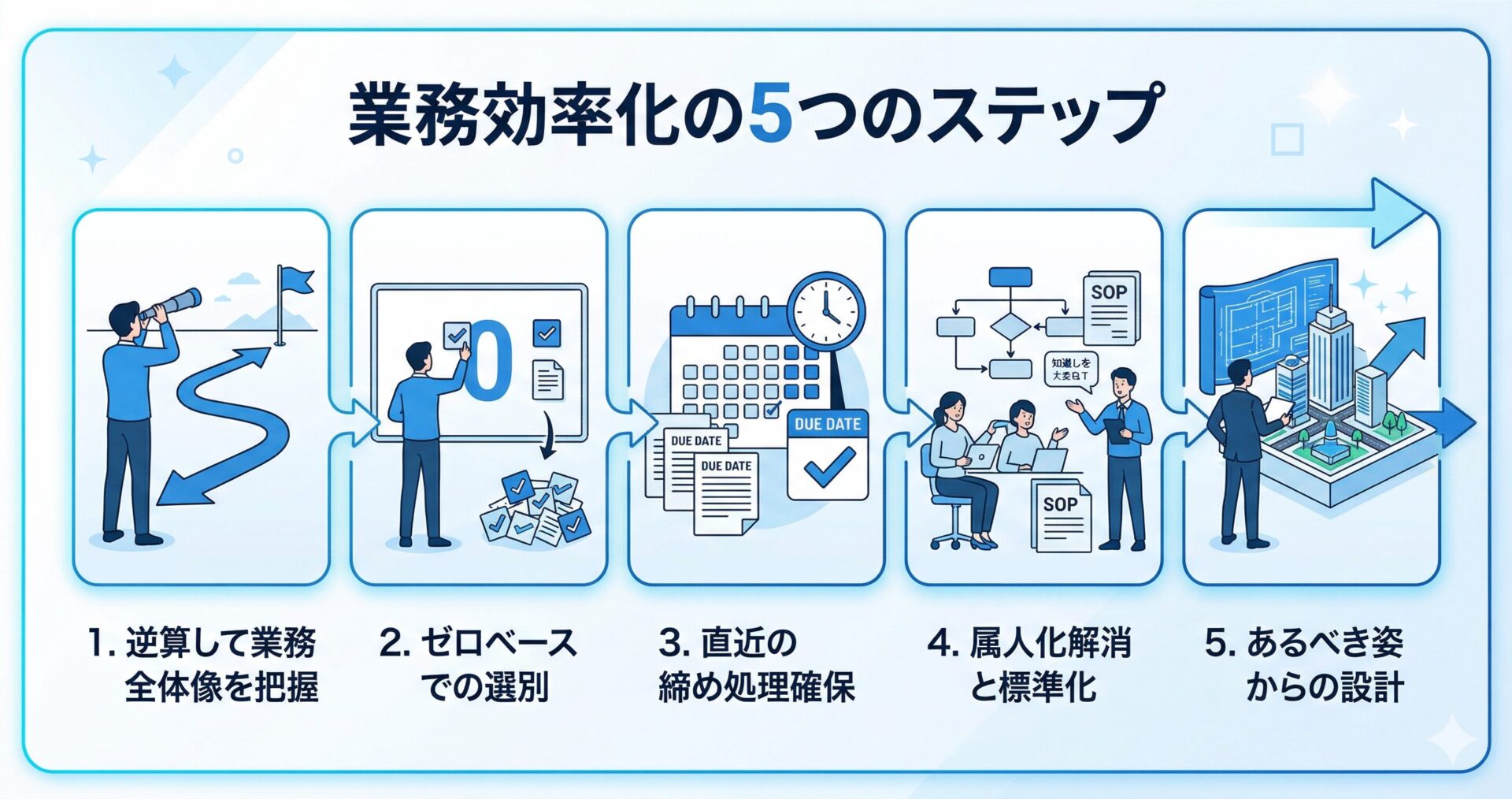 属人化が進んだ状態での退職は、確かに痛手です。しかし同時に、これまでの経理をゼロベースで見直せる機会でもあります。「元に戻す」のではなく「あるべき姿に作り直す」視点で、以下の5つの行動を取ってください。